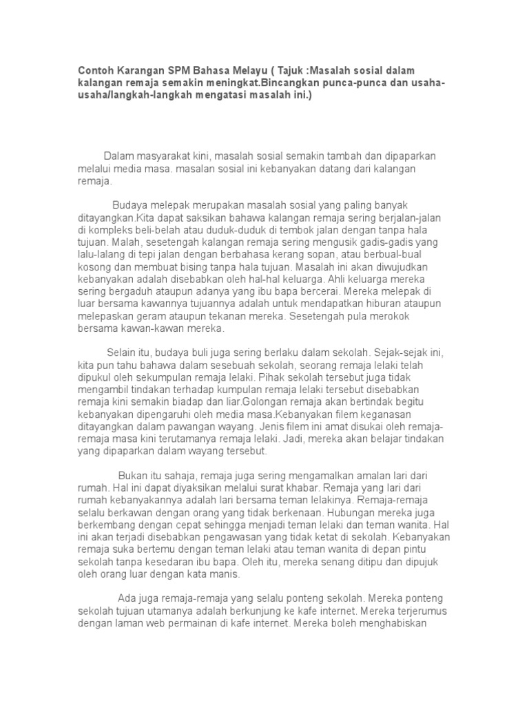 Jumlah keseluruhan karangan pelajar ialah 500 patah perkataan dan memenuhi kehendak arahan soalan. Contoh karangan spm karangan dimensi masyarakat cara cara mengawal penggunaan media sosial dalam kalangan masyarakat penggunaan media sosial amat popular di malaysia. Karangan cemerlang spm / description. Dalam masyarakat kini, masalah sosial semakin tambah dan dipaparkan melalui media masa. Story wa romantis anak basket.
